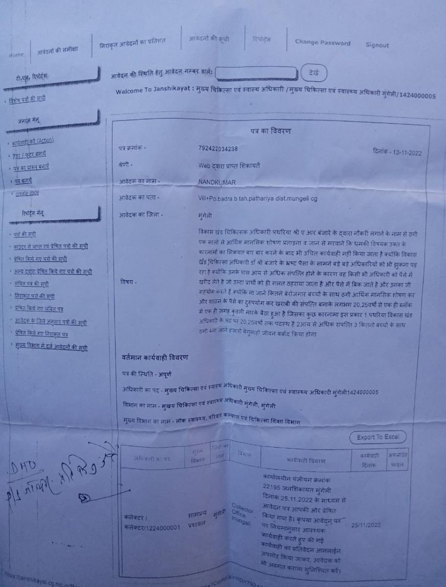 स्वास्थ्य विभाग जिला मुंगेली के खंड चिकित्सा अधिकारी पथरिया के डॉ ए. आर. बंजारे जो किसी स्वास्थ्य मंत्री से कम नहीं है क्योंकि बीएमओ पथरिया लंबे समय से खंड चिकित्सा अधिकारी के पद पर पदस्थ हैं जो कुंडली मार के बरसों से एक ही जगह बैठे है। जो स्वास्थ्य विभाग को दीमक की तरह धीरे धीरे चाट रहे है जो ना जाने अरबों कि समपत्ती विभागों की पैसों की दो नंबरी और बेरोजगार युवाओं से नौकरी लगाने के नाम से, आत्महत्या को हत्या और हत्या को आत्महत्या का रिपोर्ट बनाने, अवैध क्लीनिक हॉस्पिटल चलवाने ,जीवन दीप में भर्ती, संविदा पद में भर्ती ,व्यवस्था के तहत भर्ती, दैनिक वेतन भोगी के बहाने, प्राइवेट गाड़ी को मंथली में चलवाने, अपने चहेते लोगों के बच्चे को काम में रखने, कर्मचारियों को अवकाश देने व ज्वाइनिंग देने के बदले पैसे लेने ,अपने चहेते कर्मचारियों से अवैध क्लीनिक चलवाने और सरकारी दवाओं का उपयोग क्लीनिक में सेकरवाने, कर्मचारियों को आवास आवंटन करवाने,कोविड कॉल में आए राशि का गबन करने और अन्य काले कारनामे के बहाने अरबों की संपत्ति बना लिया है और जिसके चलते पथरिया बीएमओ के पास काली कमाई कर अत्यधिक ताकतवर हो गए है क्योंकि जिनके पास अत्यधिक पैसे होते हैं वहीं कलयुग का भगवान माना जाता है। और पूजे जाते हैं, और उनके सामने किसी का नहीं चलता है बल्कि उनके काली कमाई के सामने अधिकारी कर्मचारी नत मस्तक हो जाते है जिससे बीएमओ पथरिया का हौसला बुलंद है और कोई कुछ नहीं कर पाते है बल्कि उनका ही सहयोग किया जाता है क्योंकि वह पैसे वाले है उनका ही बात सही होता है और पैसे के चलते बीएमओ मंत्री से कम नहीं है क्योंकि उनके उपर बड़े बड़े मंत्री नेताओ का भी हाथ है जिसके चले बीएमओ पथरिया लंबे समय से बीएमओ के पद में पदस्थ है जिसकी शिकायत कलेक्टर मुंगेली, पुलिस अधीक्षक मुंगेली, जन शिकायत निवारण विभाग छत्तीसगढ़ शासन ,लोक प्रशासनिक विभाग भारत सरकार को भी किया जा चुका है लेकिन जिले के उच्च अधिकारी और मंत्री नेताओ का सहयोग के चलते बीएमओ पथरिया डॉ ए. आर.बंजारे के उपर कोई कार्यवाही आज तक नहीं हो पाया है और होगी भी नहीं बल्कि कुण्डली मार के बैठा है और दीमक की तरह धीरे धीरे खोखला कर आय से अधिक संपत्ति बना ली है। जिसके चलते बड़े बड़े उच्च अधिकारी भी कुछ नहीं कर सकते हैं क्योंकि काला धन की इतनी ताकत होती है कि उनके सामने कोई नहीं टिक सकता है जो बीएमओ पथरिया के पास है।
