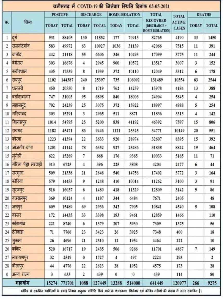 रायपुर। कोरोना वायरस को लेकर छत्तीसगढ़ स्वास्थ्य विभाग ने मेडिकल बुलेटिन जारी किया बुलेटिन के मुताबिक प्रदेश में आज 15,274 नए कोरोना मरीजों की पहचान की गई वही 14376 मरीज स्वस्थ होने उपरांत डिस्चार्ज किये गए । वही 266 मरीजों की इलाज के दौरान मौत हुई है । जिला वार जानकारी की सूची में उपस्थित है:-