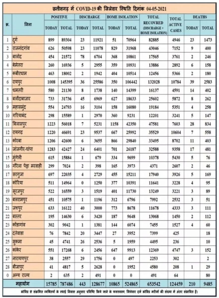 रायपुर। कोरोना वायरस को लेकर छत्तीसगढ़ स्वास्थ्य विभाग ने मेडिकल बुलेटिन जारी किया बुलेटिन के मुताबिक प्रदेश में आज 15,785 नए कोरोना मरीजों की पहचान की गई वही 11,308 मरीज स्वस्थ होने उपरांत डिस्चार्ज किये गए है। वही 210 मरीजों की इलाज के दौरान मौत हुई है । आज सबसे ज्यादा नए मरीज जांजगीर चांपा , बिलासपुर, रायगढ़ ,कोरबा में  देखे गए प्रदेश के सभी जिलों के लिए सूची देखें:-