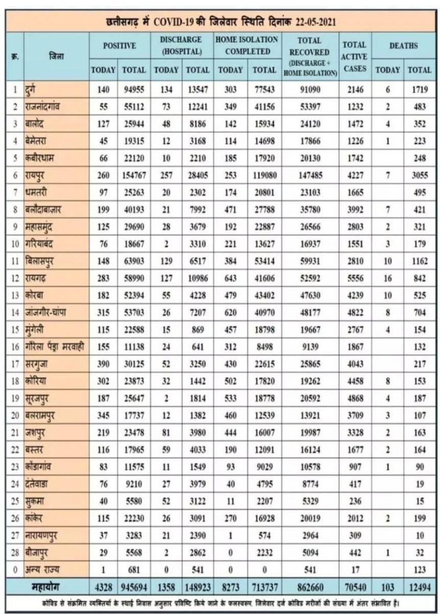 रायपुर। कोरोना वायरस को लेकर छत्तीसगढ़ स्वास्थ्य विभाग ने मेडिकल बुलेटिन जारी किया बुलेटिन के मुताबिक प्रदेश में आज 4,328 नए कोरोना मरीजों की पहचान की गई वही 9,631 मरीज़ स्वस्थ होने के उपरांत डिस्चार्ज/रिकवर्ड हुए। और 103 मरीजों की इलाज के दौरान मौत हुई है। जिला वार जानकारी के लिए देखिए सूची :-