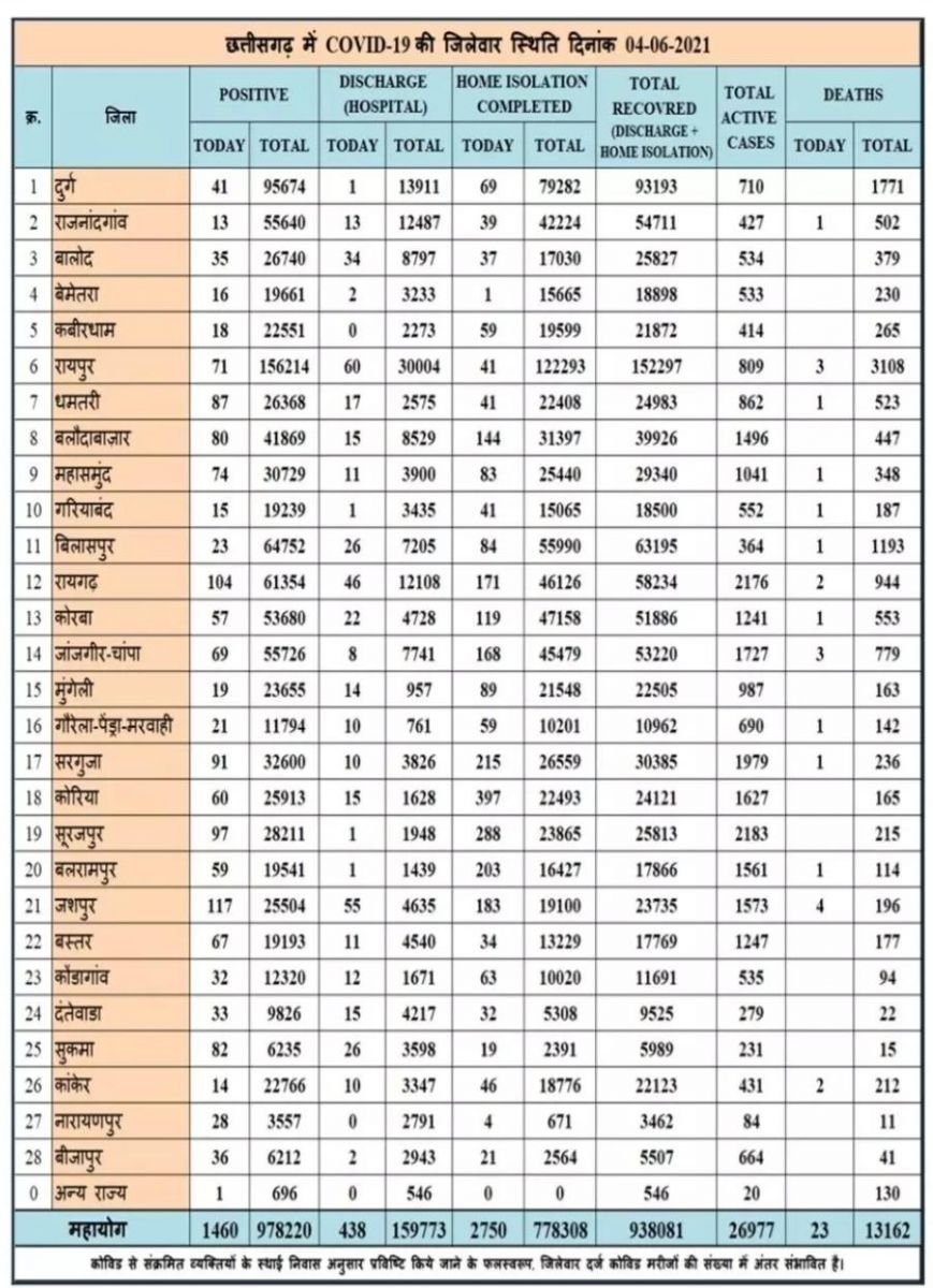 रायपुर। कोरोना वायरस को लेकर छत्तीसगढ़ स्वास्थ्य विभाग ने मेडिकल बुलेटिन जारी किया बुलेटिन के मुताबिक प्रदेश में आज 1,460 नए कोरोना पॉजिटिव मरीज़ों की पहचान हुई वहीं 3,188 मरीज़ स्वस्थ होने के उपरांत डिस्चार्ज/रिकवर्ड हुए है और 23 कोरोना मरीजों की इलाज के दौरान  मृत्यु हुई जिला वार जानकारी के लिए सूची देखें :-