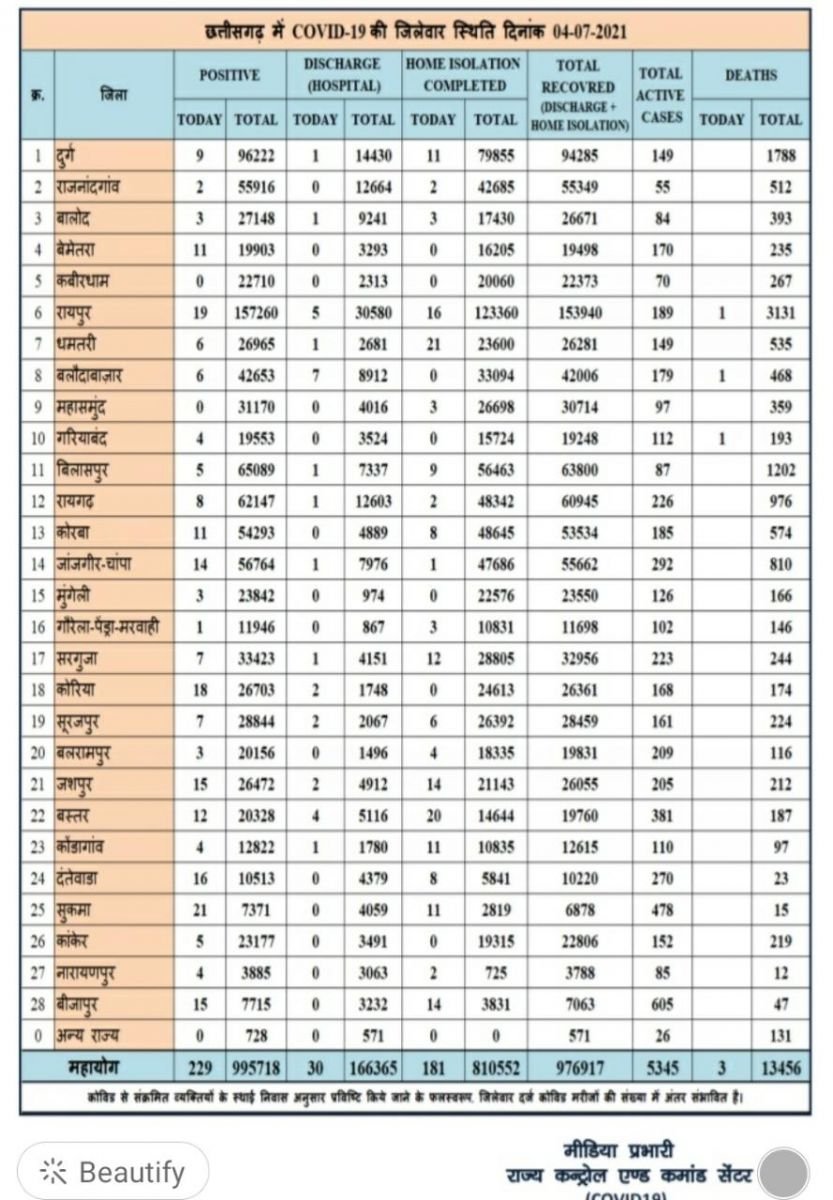रायपुर। कोरोना वायरस को लेकर छत्तीसगढ़ स्वास्थ्य विभाग ने मेडिकल बुलेटिन जारी किया बुलेटिन के मुताबिक प्रदेश में आज 229 नए कोरोना पॉजिटिव मरीज़ों की पहचान की गई और 211 मरीज़ स्वस्थ होने के उपरांत डिस्चार्ज/रिकवर्ड हुए। वही 3 मरीजों की इलाज के दौरान मौत हुई  रायपुर, बलोदाबाजार व गरियाबंद में 1-1 कहां कितने कोरोना मरीज मिले देख सूची :-