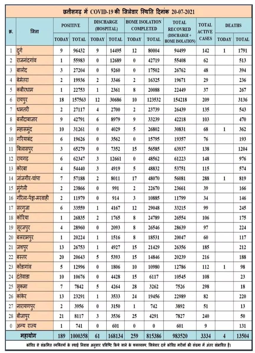रायपुर। कोरोना वायरस को लेकर छत्तीसगढ़ स्वास्थ्य विभाग ने मेडिकल बुलेटिन जारी किया बुलेटिन के मुताबिक प्रदेश में आज 189 नए कोरोना पॉजिटिव मरीज़ों की पहचान की गई और 320 मरीज़ स्वस्थ होने के उपरांत डिस्चार्ज/रिकवर्ड हुए। वही 4 मरीजों की इलाज के दौरान  दुर्ग, चांपा जांजगीर , महासमुंद और कोडागांव में एक एक मौत हुई। कहां कितनी मरीज मिले देखे सूची।