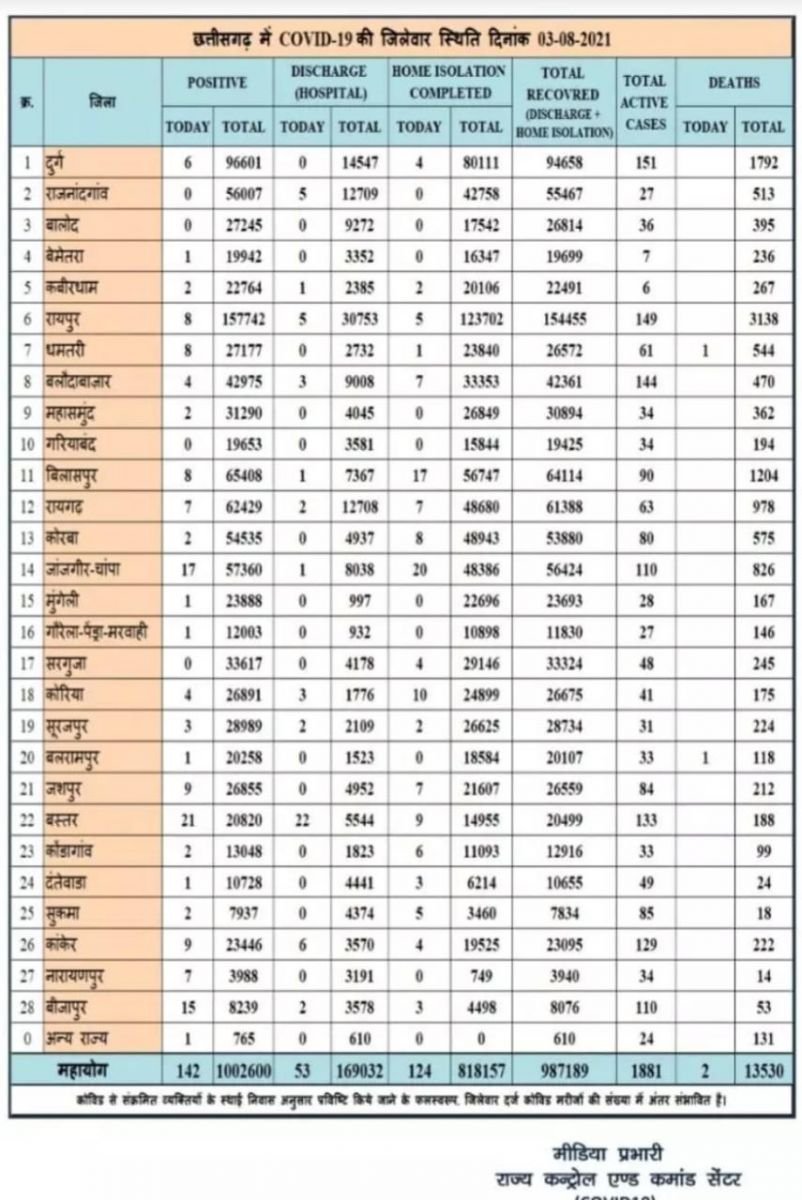 छत्तीसगढ़ में मंगलवार को 142 नए कोरोना मरीज, 2 लोगों की हुई मौत