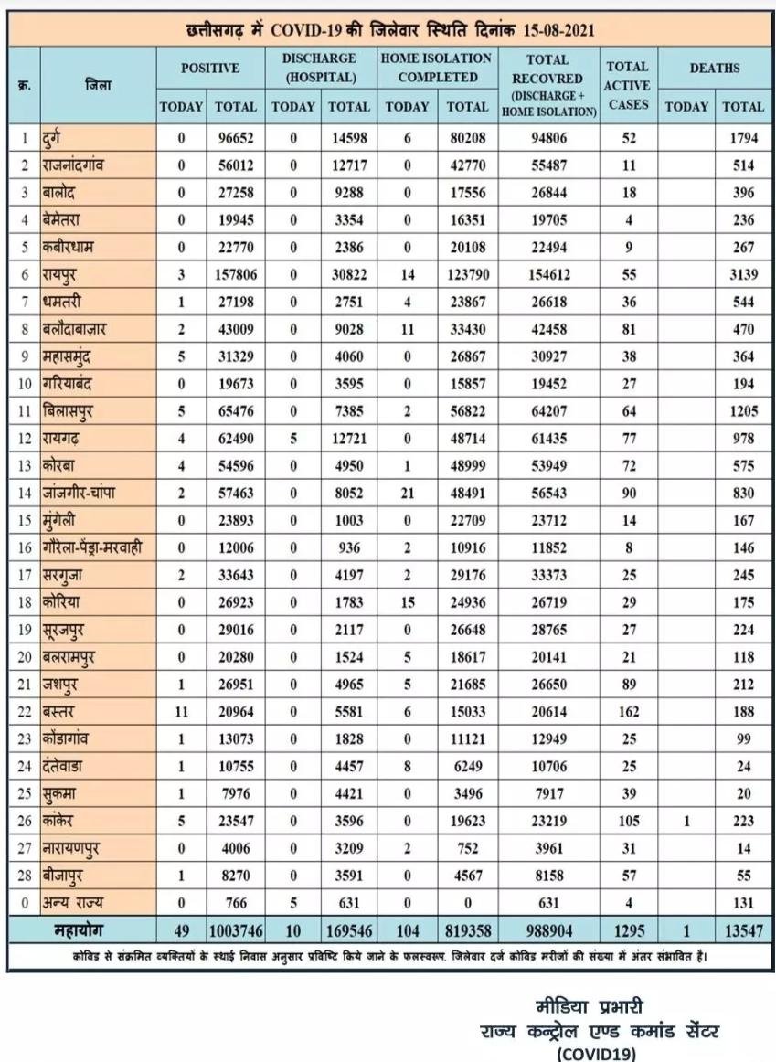 छत्तीसगढ़ में आज 49 नए कोरोना मरीज मिले और 1 की हुई मौत , स्वास्थ्य विभाग ने जारी किया बुलेटिन