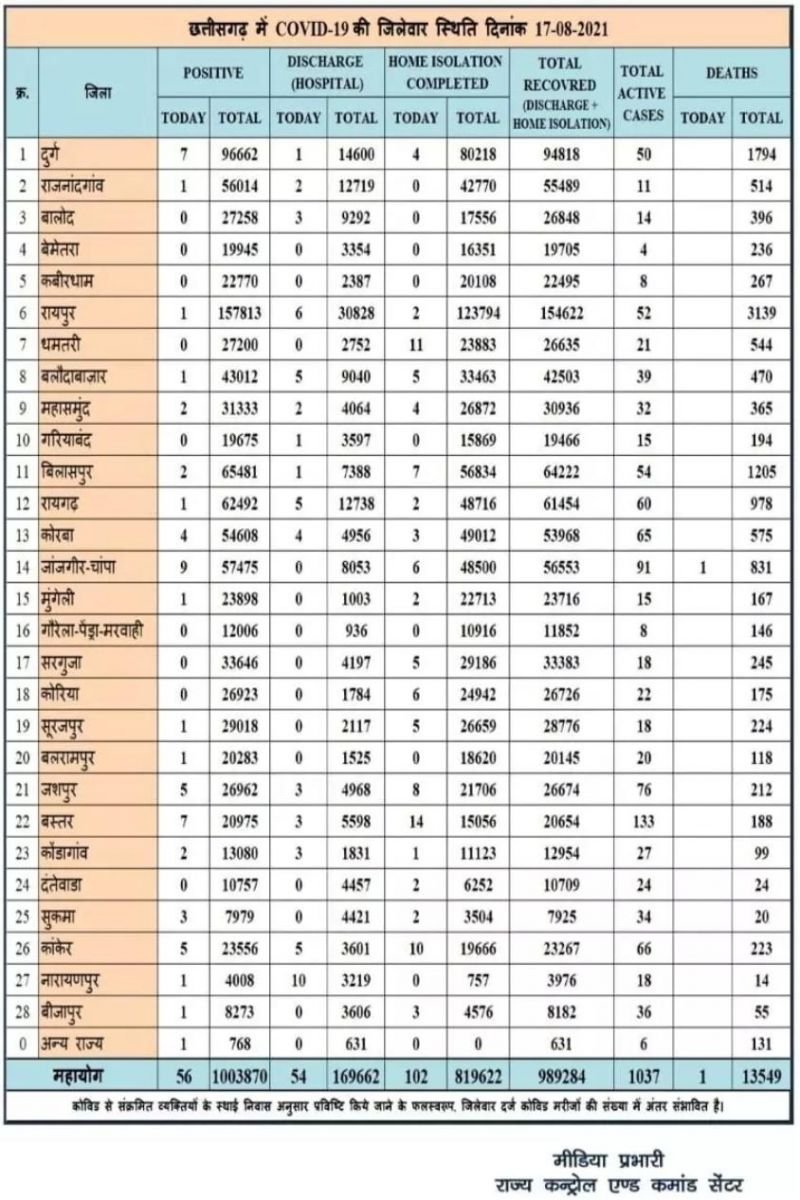 रायपुर। कोरोना वायरस को लेकर छत्तीसगढ़ स्वास्थ्य विभाग ने मेडिकल बुलेटिन जारी किया बुलेटिन के मुताबिक प्रदेश में आज 56 नए कोरोना पॉजिटिव मरीजों की पहचान की गई और 156 मरीज स्वस्थ होने उपरांत डिस्चार्ज किये गए वही एक मरीज की इलाज के दौरान चांपा जांजगीर में मौत हुई है कहां कितने मरीज मिले जानने के लिए देखें सूची -