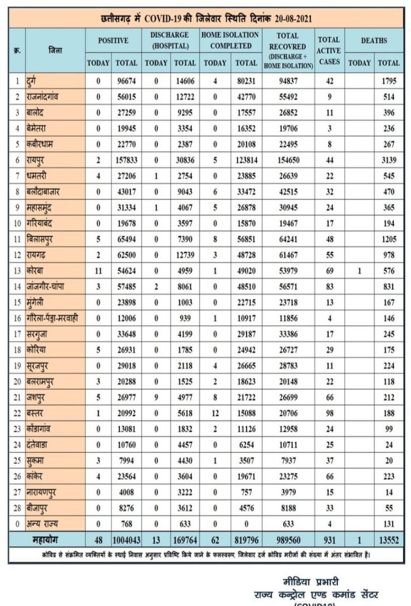 छत्तीसगढ़ में आज 48 नए कोरोना मरीज मिले और 1 मरीज की हुई मौत, स्वास्थ्य विभाग ने जारी किया बुलेटिन