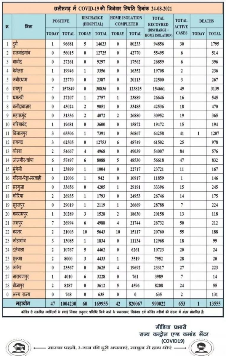 छत्तीसगढ़ में आज 47 नए कोरोना मरीज मिले और, स्वास्थ्य विभाग ने जारी किया बुलेटिन