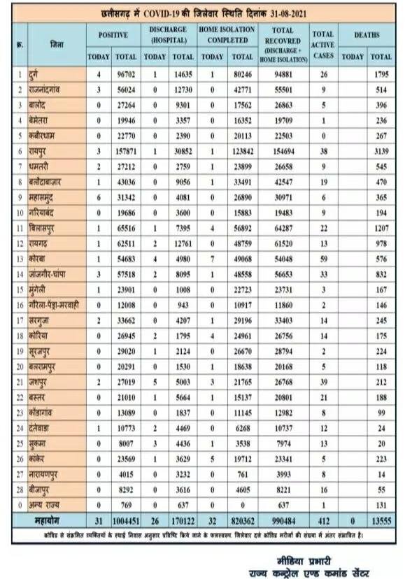 रायपुर। कोरोना वायरस को लेकर छत्तीसगढ़ स्वास्थ्य विभाग ने मेडिकल बुलेटिन जारी किया बुलेटिन के मुताबिक प्रदेश में आज 31 नए कोरोना पॉजिटिव मरीज़ों की पहचान की गई और 58 मरीज़ स्वस्थ होने के उपरांत डिस्चार्ज/रिकवर्ड हुए। और किसी के मरने की कोई खबर नहीं है स्वास्थ्य विभाग में बुलेटिन जारी करते हुए बताया कहां जितने नए मरीज मिले जानने के लिए देखें जिला बार सूची-