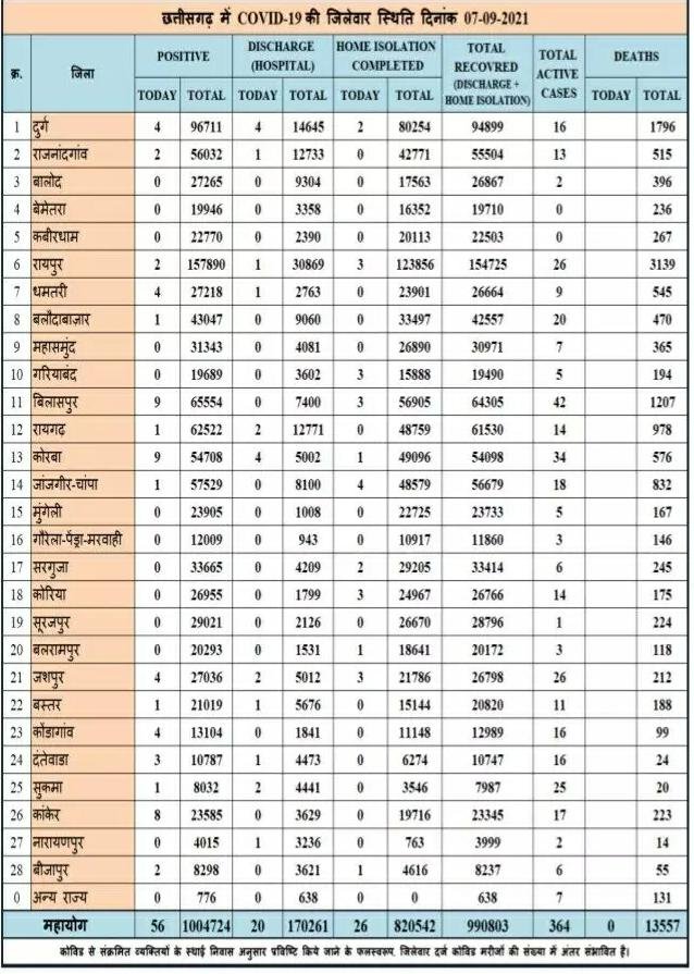 छत्तीसगढ़ में 7 अगस्त को 56 नए कोरोना मरीज मिले