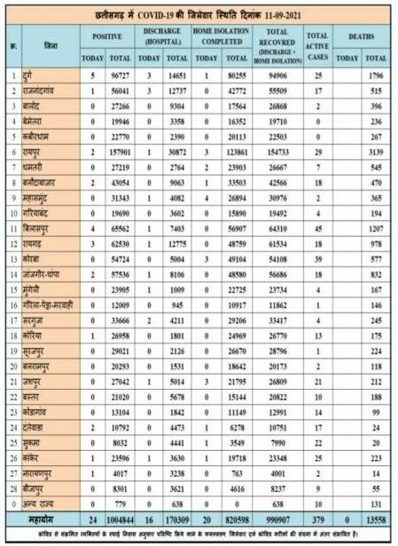 छत्तीसगढ़ में आज 24 नये कोरोना मरीज मिले और किसी की मरने की कोई खबर नहीं है स्वास्थ्य विभाग में यह बुलिटिन जारी किया किस जिले कितने नए मरीज मिले जानने के लिए देखें सूची -