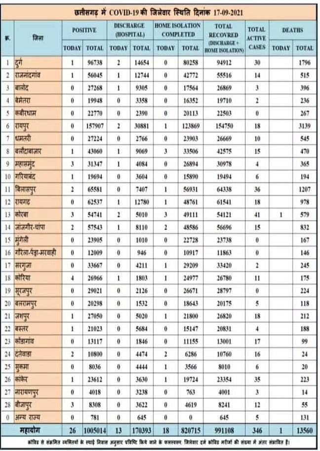 छत्तीसगढ़ में आज 26 नए कोरोना मरीज मिले और एक की हुई मौत