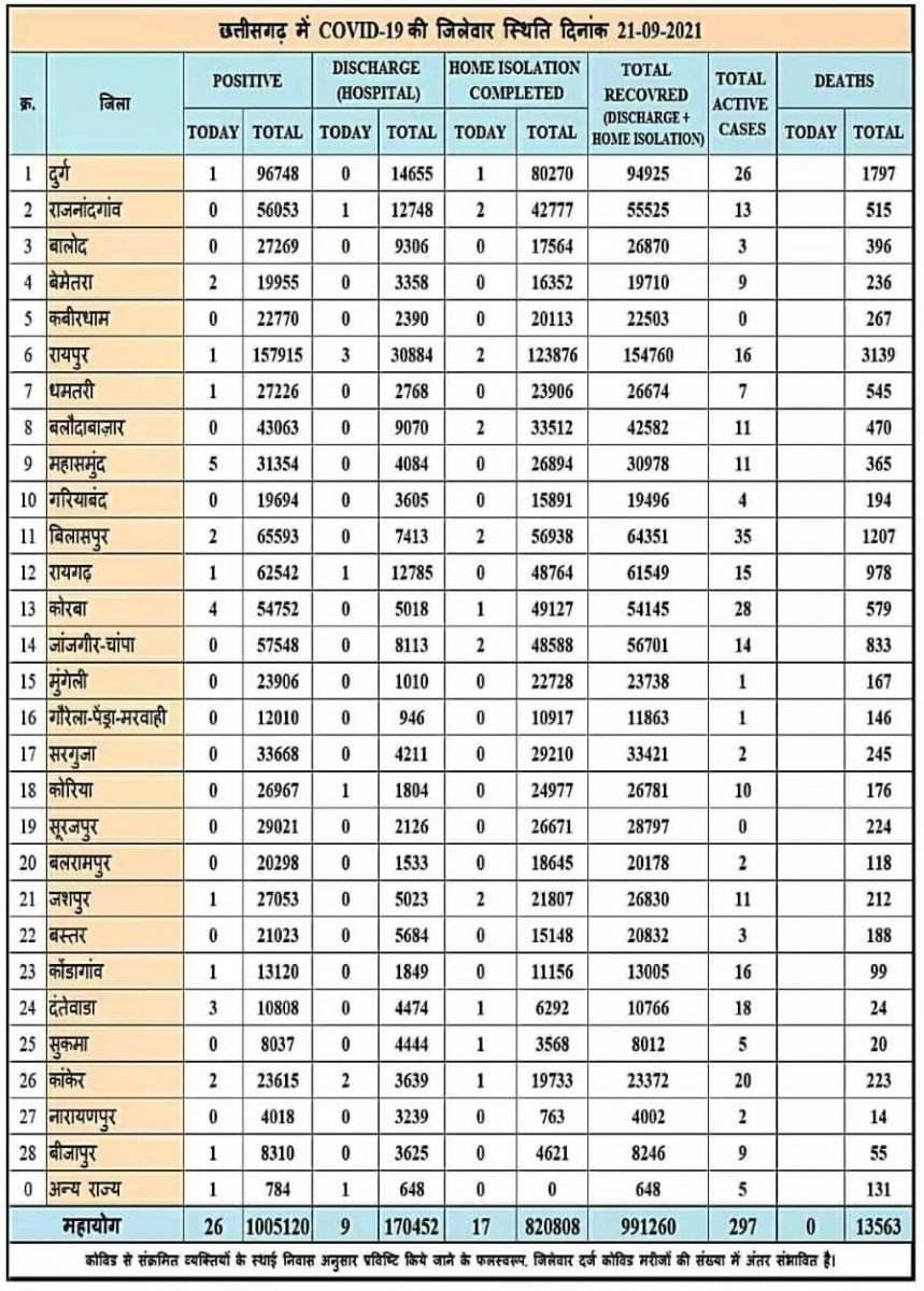 रायपुर। कोरोना वायरस को लेकर छत्तीसगढ़ स्वास्थ्य विभाग ने मेडिकल बुलेटिन जारी किया बुलेटिन के मुताबिक प्रदेश में आज 26 नए कोरोना मरीजों की पहचान की गई और 26 कोरोना मरीज स्वस्थ उपरांत डिस्चार्ज किये गए वही प्रदेश में आज कोरोना संक्रमित एक भी मरीज की मौत नहीं हुई जानिये कहाँ कितने मरीज मिले।