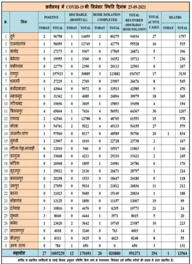 छत्तीसगढ़ में आज 27 नए कोरोना मरीज मिले और एक की हुई मौत