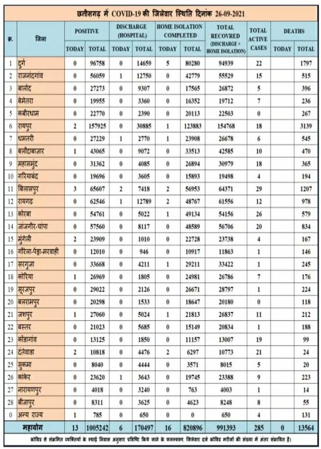 रायपुर। कोरोना वायरस को लेकर छत्तीसगढ़ स्वास्थ्य विभाग ने मेडिकल बुलेटिन जारी किया बुलेटिन के मुताबिक प्रदेश में आज 13 नए कोरोना मरीजों की पहचान की गई और 32 कोरोना मरीज स्वस्थ होने उपरांत डिस्चार्ज किये गए वही प्रदेश में आज कोरोना संक्रमित एक भी मरीज की मौत नहीं हुई जानिए कहा कितने नये मरीज मिले देखें सूची -