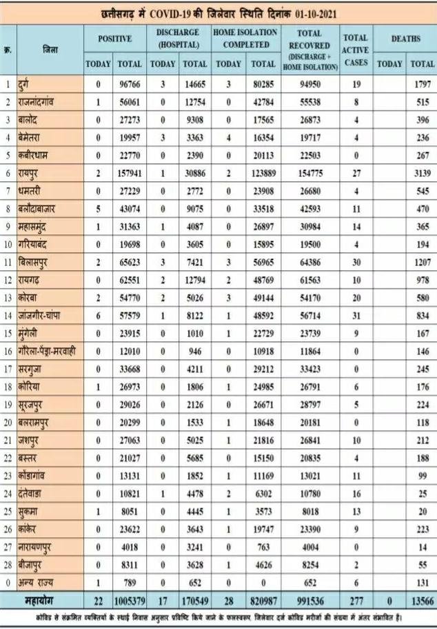 रायपुर। कोरोना वायरस को लेकर छत्तीसगढ़ स्वास्थ्य विभाग ने मेडिकल बुलेटिन जारी किया बुलेटिन के मुताबिक प्रदेश में आज 22 नए कोरोना पॉजिटिव मरीज़ों की पहचान की गई और 45 मरीज़ स्वस्थ होने के उपरांत डिस्चार्ज/रिकवर्ड हुए। वही प्रदेश में आज कोरोना संक्रमित एक भी मरीज की मौत नहीं हुई  जानिए किस जिले में कितनी मौत हुई देखें सूची -