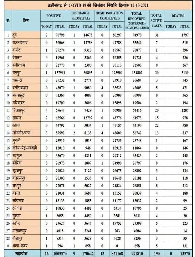 रायपुर। कोरोना वायरस को लेकर छत्तीसगढ़ स्वास्थ्य विभाग ने मेडिकल बुलेटिन जारी किया बुलेटिन के मुताबिक प्रदेश में आज 16 नए कोरोना पॉजिटिव मरीज़ों की पहचान की गई और 22 मरीज़ स्वस्थ होने के उपरांत डिस्चार्ज/रिकवर्ड हुए। वही प्रदेश में कोरोना संक्रमित एक भी मरीज की मौत नहीं हुई  जानिए किस जिले में कितने मरीज मिले देखे सूची -
