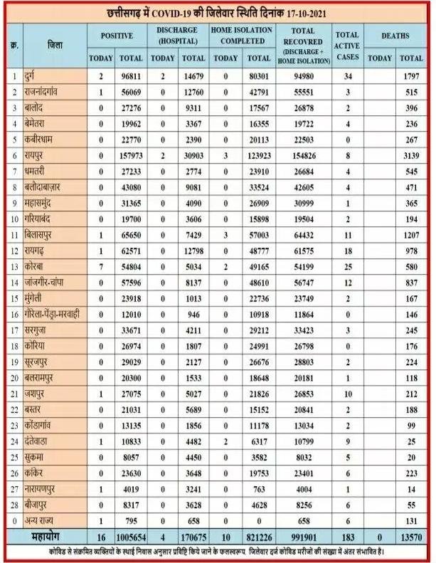 रायपुर। कोरोना वायरस को लेकर छत्तीसगढ स्वास्थ्य विभाग ने मेडिकल बुलेटिन जारी किया बुलेटिन के मुताबिक प्रदेश में आज 16 नए कोरोना पॉजिटिव मरीज़ों की पहचान की गई और 14 मरीज़ स्वस्थ होने के उपरांत डिस्चार्ज/रिकवर्ड हुए। वही प्रदेश में कोरोना संक्रमित एक भी मरीज की मौत नहीं हुई जानिए किस जिले में कितनी मौत हूई देखें सूची -