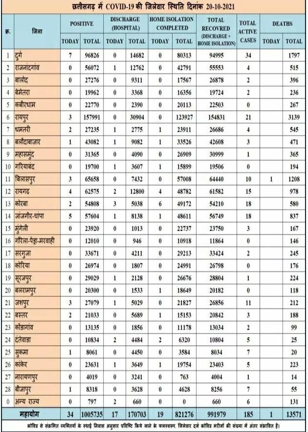 छत्तीसगढ़ में आज 34 नए कोरोना मरीज मिले, और हुई एक की मौत