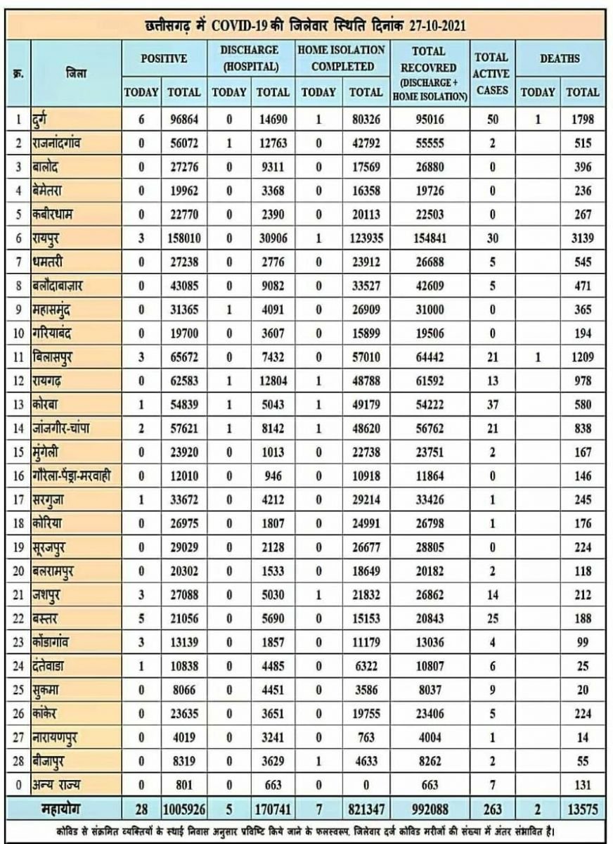 रायपुर। कोरोना वायरस को लेकर छत्तीसगढ़ स्वास्थ्य विभाग ने मेडिकल बुलेटिन जारी किया  बुलेटिन के मुताबिक प्रदेश में आज 28 नए कोरोना मरीजों की पहचान की गई है. और 12 मरीज स्वस्थ्य होने उपरांत डिस्चार्ज किये गए वही कोरोना  से बिलासपुर व दुर्ग में की इलाज के दौरान मौत एक एक जाने गई। कहां कितने मरीज मिले जानने के लिए देखें पूरी सूची -
