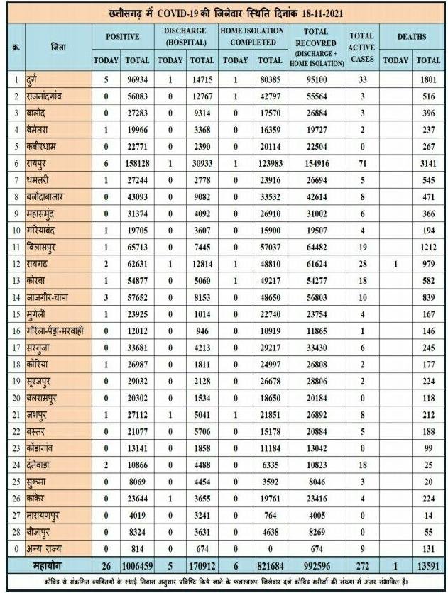 छत्तीसगढ़ में 26 नए कोरोना मरीज मिले और एक की हुई मौत