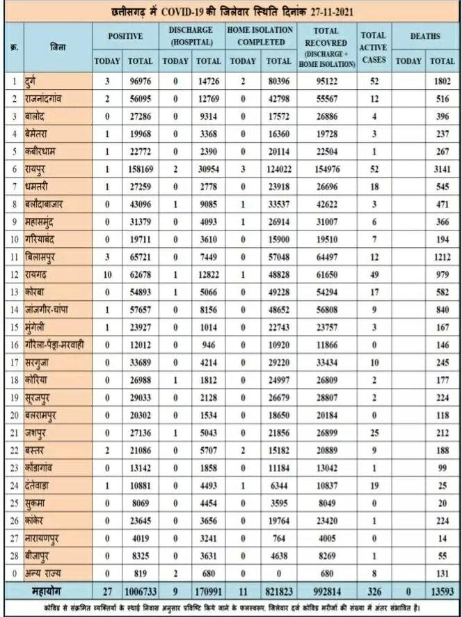 छत्तीसगढ़ में आज 27 कोविड-19 मरीज मिले