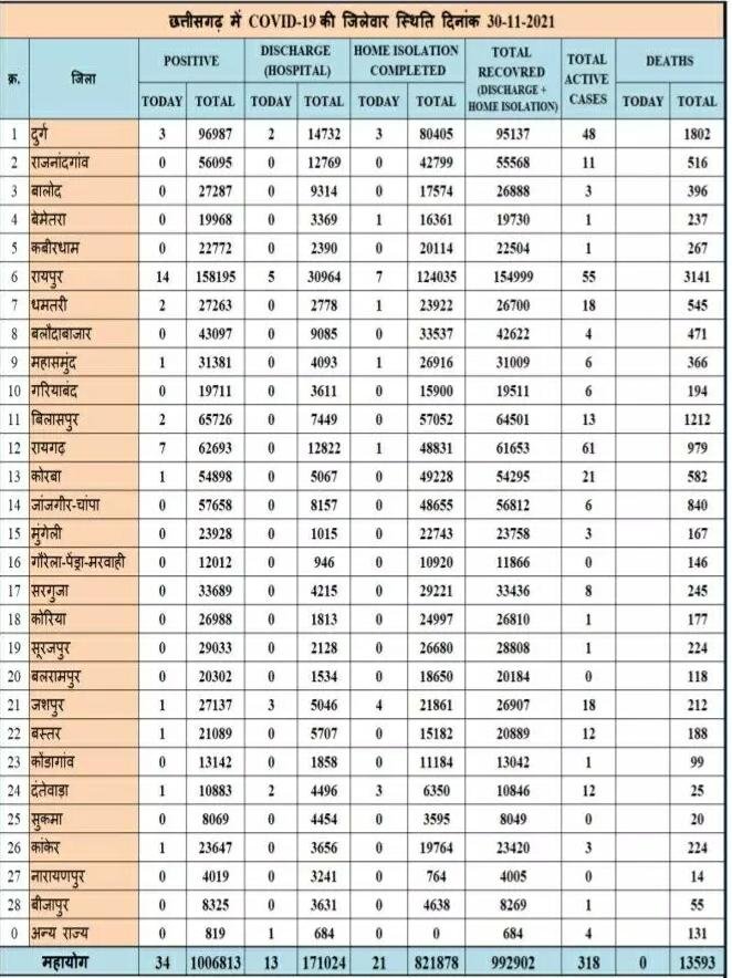 छत्तीसगढ़ में आज 34 नए कोरोना मरीज मिले