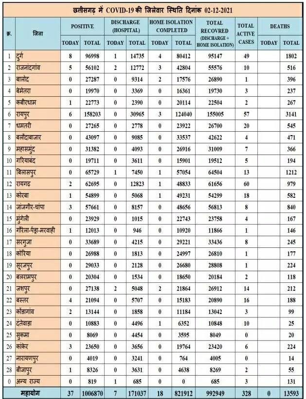 छत्तीसगढ़ में आज 37 नये कोविड 19 मरीज मिले