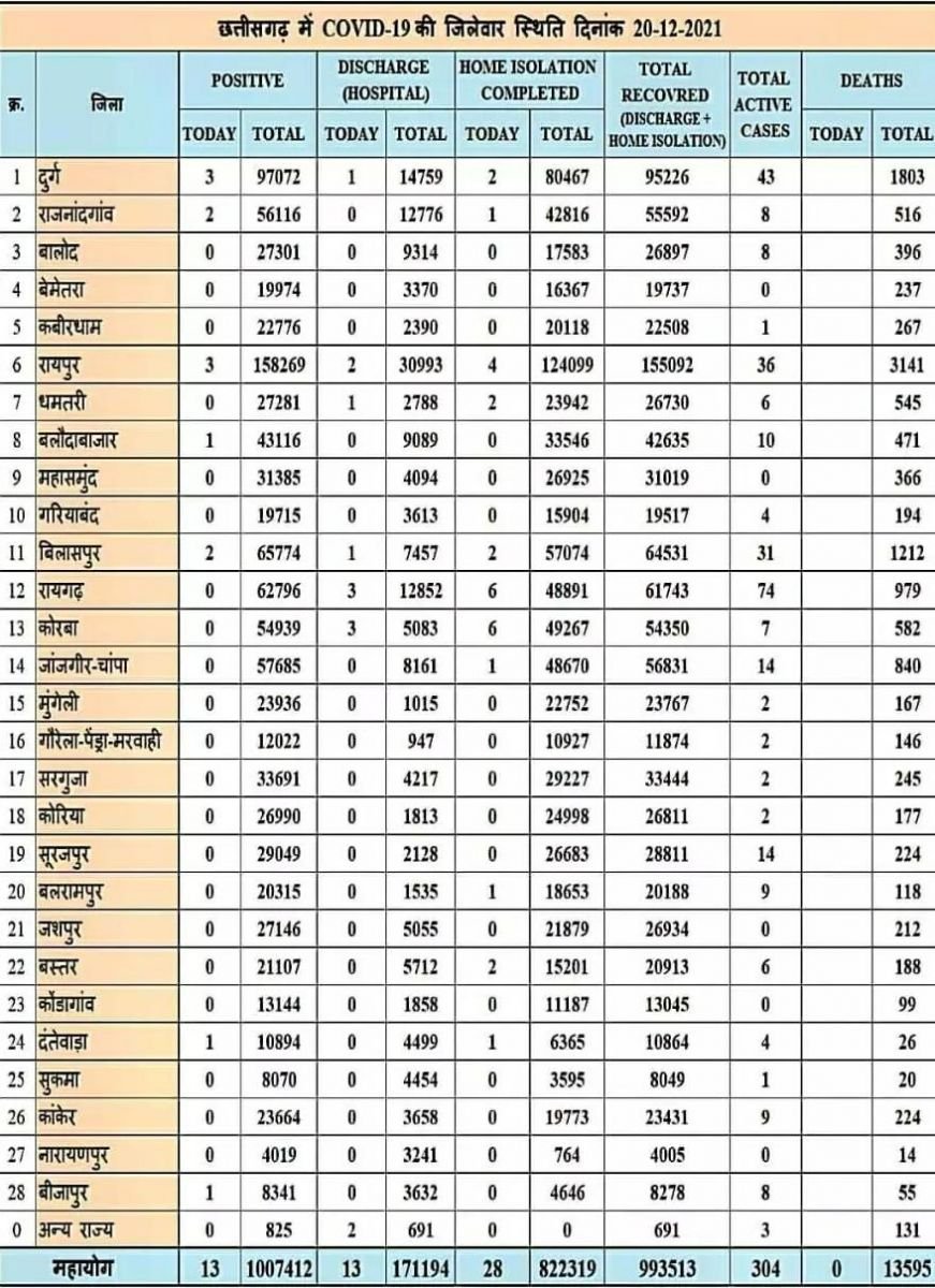 छत्तीसगढ़ में आज 13 नये मरीज मिले और किसी की मरने की कोई खबर नहीं स्वास्थ्य विभाग ने जारी किया बुलिटिन