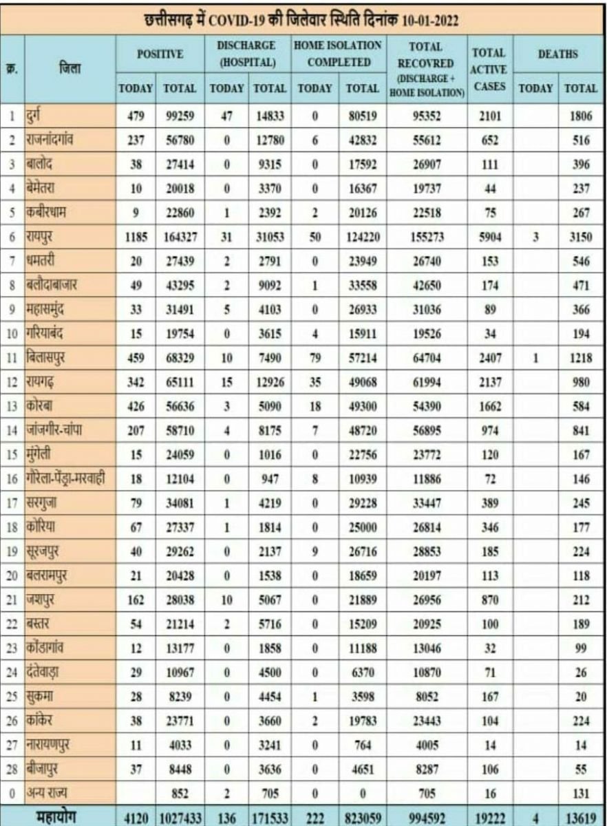 छत्तीसगढ़ में आज 4120 नये कोविड 19 मरीज, मिले और 4 की हुई मृत्यु