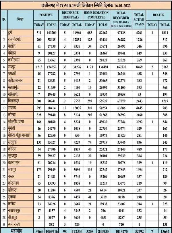 छत्तीसगढ़ में आज 3963 नए कोरोना मरीज मिले, 7 की हूई मौत