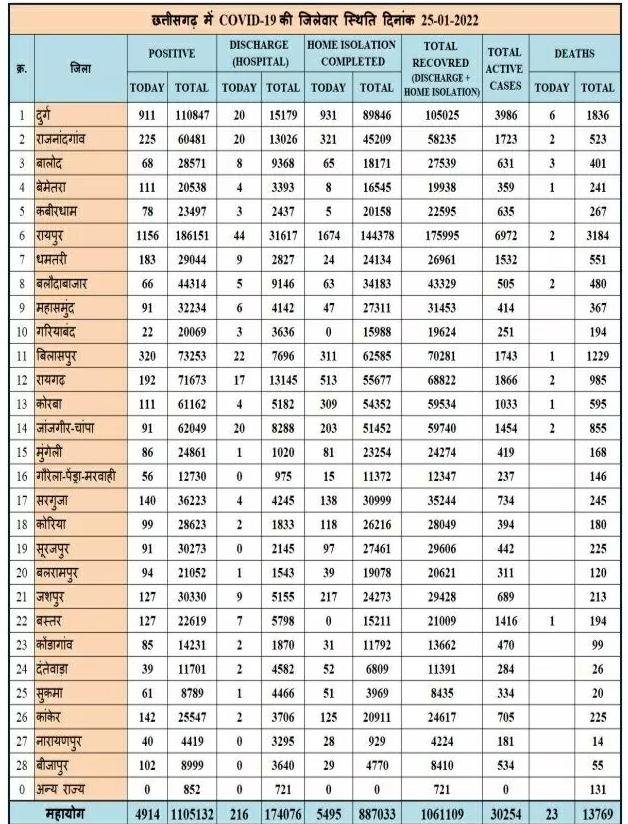 छत्तीसगढ़ में आज 4914 नए कोरोना मरीज मिले, 23 की हूई मौत स्वास्थ्य विभाग ने जारी किया बुलेटिन