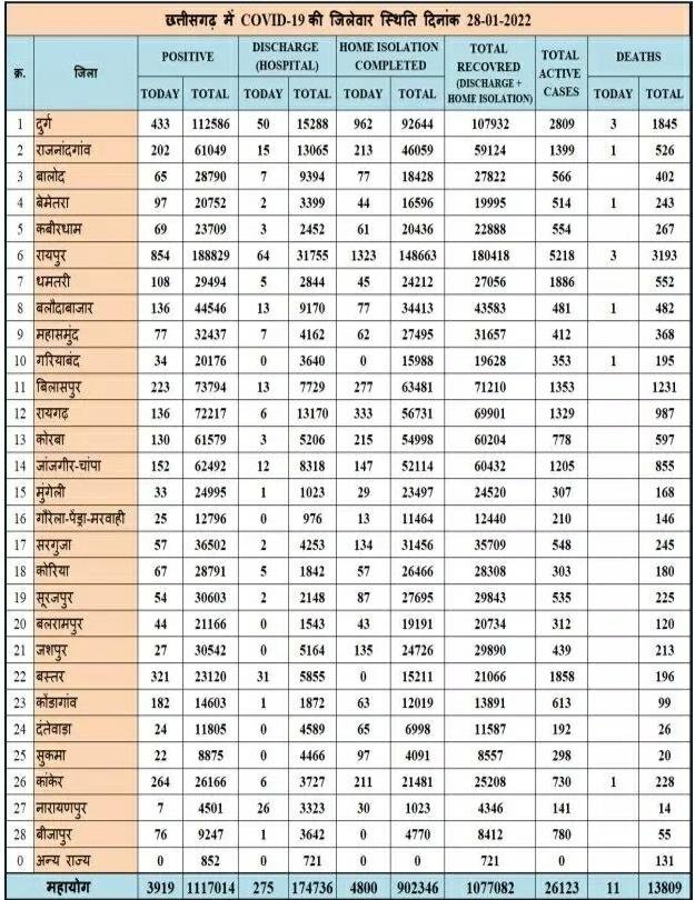 छत्तीसगढ़ में आज 3916 नए कोरोना मरीज मिले, 11 की हूई मौत, स्वास्थ्य विभाग ने जारी किया बुलेटिन