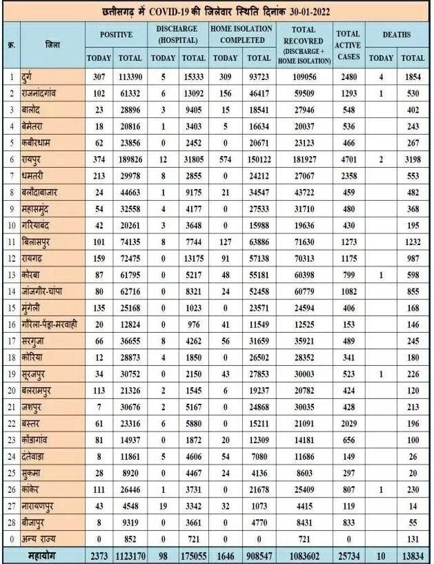 छत्तीसगढ़ में आज 2373 नए कोरोना मरीज मिले, 10 की हूई मौत