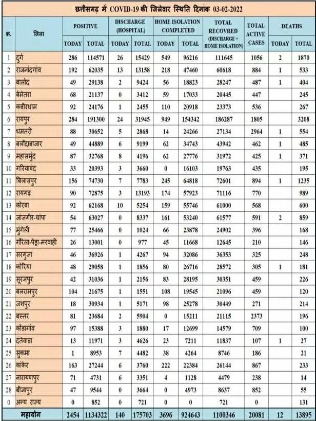 छत्तीसगढ़ में आज मिले 2454 नए कोरोना मरीज मिले, 12 की हूई मौत स्वास्थ्य विभाग ने जारी किया बुलेटिन