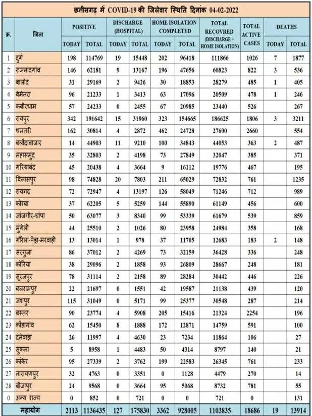 रायपुर। कोरोना वायरस को लेकर छग स्वास्थ्य विभाग ने मेडिकल बुलेटिन जारी किया बुलेटिन के मुताबिक आज 2113 नए कोरोना पॉजिटिव मरीज़ों की पहचान की गई जिसमें सबसे ज्यादा मरीज राजधानी रायपुर, रायगढ़, दुर्ग, राजनांदगांव और कवर्धा से है.और 3489 मरीज़ स्वस्थ होने के उपरांत डिस्चार्ज/रिकवर्ड हुए। वही 19 मरीजों की इलाज के दौरान मौत हुई  जानिए किस जिले में कितने नए मरीज मिले और किन किन जिलों में कितनी हुई मौतें देखें सूची -