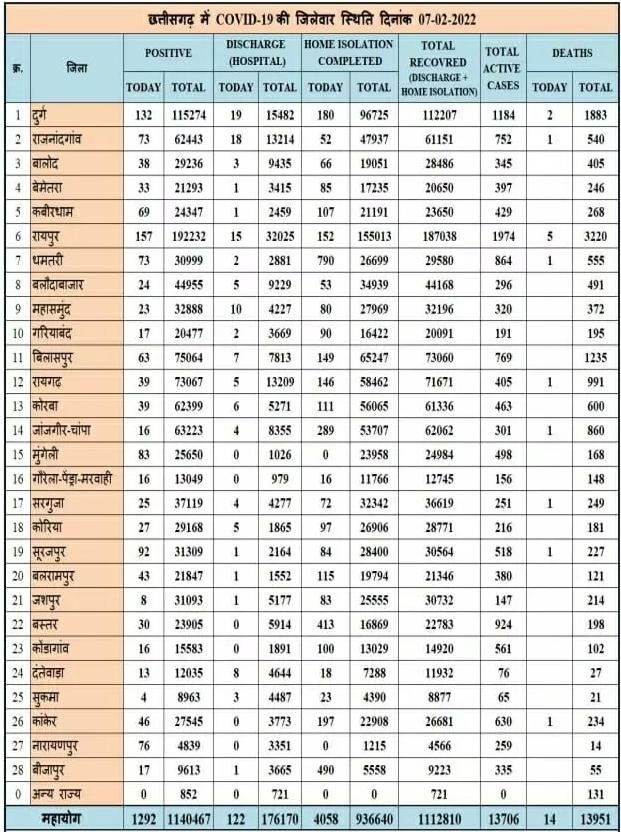 छत्तीसगढ़ में आज 1292 नए कोरोना मरीज मिले, 14 की हूई मौत