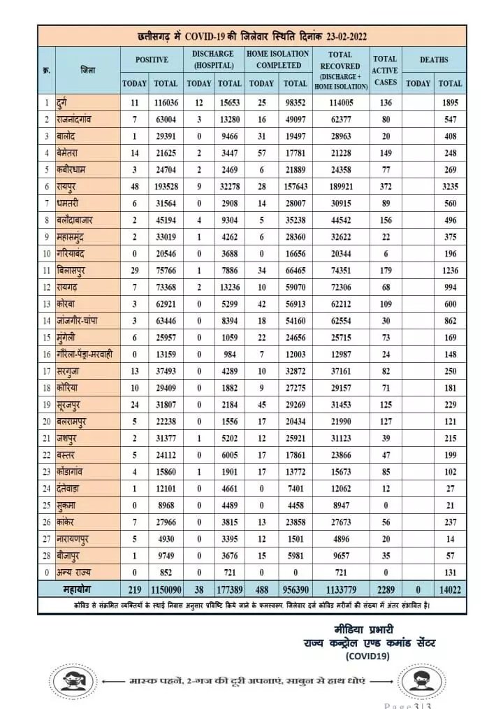 रायपुर। कोरोना वायरस को लेकर छग स्वास्थ्य विभाग ने मेडिकल बुलेटिन जारी किया बुलेटिन के मुताबिक आज 219 नए कोरोना पॉजिटिव मरीज़ों की पहचान की गई है। जिसमें सबसे ज्यादा मरीज राजधानी रायपुर, रायगढ़, दुर्ग, राजनांदगांव और कवर्धा से है और 526 मरीज़ स्वस्थ होने के उपरांत डिस्चार्ज/रिकवर्ड हुए। वही आज एक भी मरीज की मौत नहीं हुई है।