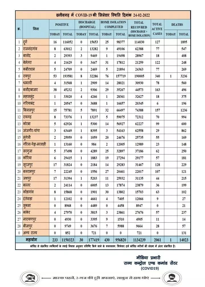 छत्तीसगढ़ में आज मिले 233 नए कोरोना मरीज, और एक की हुई मौत स्वास्थ्य विभाग ने जारी किया बुलेटिन