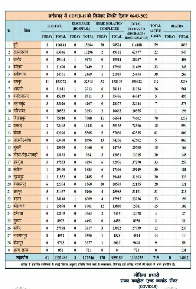 छत्तीसगढ़ में आज 61 नए कोरोना मरीज मिले