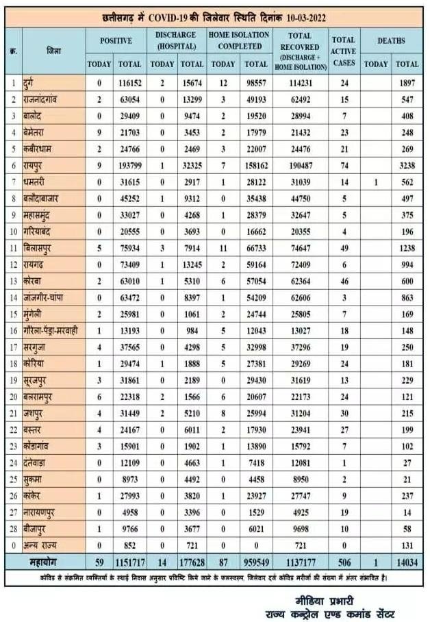 छत्तीसगढ़ में आज 59 नए कोरोना मरीज मिले, और एक की हुई मौत