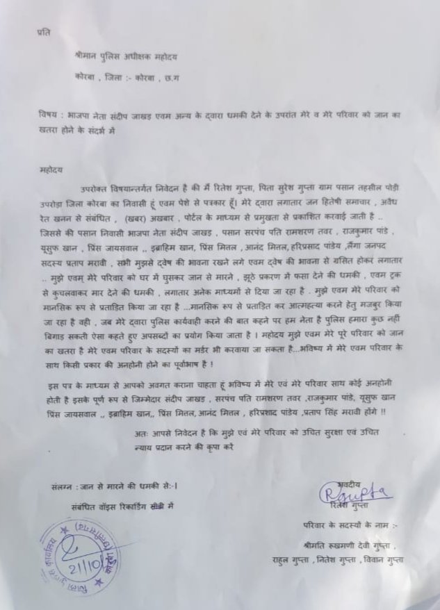 कोरबा/पसान । अवैध तौर तरीके को लेकर खबर छापना एक पत्रकार के लिए काफी मुसीबत भरा हो गया है। जहां खबर से बौखलाए दो नंबरी कार्य में संलिप्त लोगों द्वारा पहले पत्रकार को षड़यंत्र पूर्वक झूठे मामले में फसाने का प्रयास किया गया, और जब बात नही बनी तो आखिरकार उसके जान के दुश्मन बन बैठे है। पीड़ित पत्रकार ने अपने व परिवार पर जान का खतरा बताते हुए पुलिस अधीक्षक कार्यालय में स्थानीय एक भाजपा नेता सहित 10 लोगों के नाम से नामजद आवेदन देकर सुरक्षा की गुहार लगाई है। पसान निवासी पत्रकार रितेश गुप्ता ने अपने क्षेत्र के ग्राम बैरा स्थित बम्हनी नदी से जिला प्रशासन द्वारा प्रतिबंध अवधि के बाद भी रेत का खुलेआम अवैध खनन एवं परिवहन से संबंधित खबरों का प्रकाशन प्रमुखता से किया था। जिन खबरों में रेत चोरों के साथ ग्राम सरपंच, पुलिस व खनिज विभाग के सांठगांठ होने का अंदेशा को भी दर्शाया था। रेत चोरी से संबंधित छापे गए खबरों से बौखलाए उक्त कार्य मे संलिप्त लोगों द्वारा पत्रकार रितेश गुप्ता को झूठे मामले में फसाने हेतु षड़यंत्र पूर्वक उसके विरुद्ध भयादोहन सहित अन्य धाराओं के तहत पसान थाना में अपराध दर्ज करा दी गई। जिस मामले को लेकर सदभाव पत्रकार संघ छत्तीसगढ़ सहित अन्य समाजसेवी व राजनीतिक पार्टी द्वारा निष्पक्ष जांच कर पत्रकार को दोषमुक्त करने पुलिस के आला अधिकारियों से मांग किया गया था। जिसे लेकर फिलहाल पुलिस की जांच कार्यवाही चल रही है। किंतु रेत चोरी में संलिप्त लोग अब उक्त पत्रकार के दुश्मन बन बैठे है। जिसे लेकर पत्रकार रितेश ने अपने व परिवार को जान का खतरा होना बताकर एसपी कार्यालय में नामजद आवेदन देकर सुरक्षा की गुहार लगाई है। पत्रकार रितेश गुप्ता द्वारा दिए गए अपने आवेदन में उल्लेख किया है कि मैं रितेश गुप्ता, पिता श्री सुरेश गुप्ता, ग्राम पसान तहसील उप, जिला कोरबा का निवासी हूं एवं पेशे से पत्रकार हूँ। मेरे द्वारा लगातार जन हितेषी समाचार के अलावा अवैध रेत खनन से संबंधित खबरें अखबार व पोर्टल के माध्यम से प्रमुखता से प्रकाशित करवाई गई। जिससे कि रेत खनन का खबर प्रकाशन के बाद पसान निवासी भाजपा नेता संदीप जाखड़, पसान सरपंच पति रामशरण तवर, लैंगा जनपद सदस्य प्रताप मरावी के साथ राजकुमार पांडे, यूसुफ खान, प्रिंस जायसवाल, इब्राहिम खान, प्रिंस मितल, आनंद मित्तल , हरिप्रसाद पांडेय सभी मुझसे द्वेष की भावना रखने लगे है। तथा द्वेष की भावना से ग्रसित होकर लगातार मुझे एवं मेरे परिवार को घर में घुसकर जान से मारने, झूठे प्रकरण में फंसा देने व वाहन से कुचलवाकर मार देने की धमकी लगातार अनेक माध्यम से देते हुए मुझे और मेरे परिवार को लगातार मानसिक रूप से प्रताड़ित करते हुए आत्महत्या करने हेतु मजबूर किया जा रह