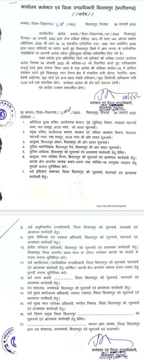 पूर्व में जारी आदेश में संशोधन करते हुए जिले में लागू रात्रिकालीन कर्फ्यू समाप्त कर दिया गया है। अब बिलासपुर नगर निगम क्षेत्र में संचालित सभी होटल, रेस्टोरंट, ढाबा, बेकरी आईटम्स, फूड कोर्ट एवं अन्य खाद्य संबंधी प्रतिष्ठान, फूड डिलीवरी अधिकतम रात्रि 12 बजे तक संचालित हो सकेंगे।