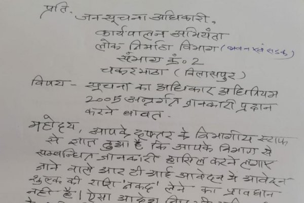 राज्य सरकार के विभाग पीडब्ल्यूडी में आरटीआई आवेदन पत्र का प्रक्रिया शुल्क नकद नहीं लिया जा रहा इससे परेशान होकर वरिष्ठ पत्रकार निर्मल माणिक ने इसी संदर्भ में जारी किया गया दिशा निर्देश कार्यालय आदेश की प्रमाणित प्रतिलिपि मांगी है।