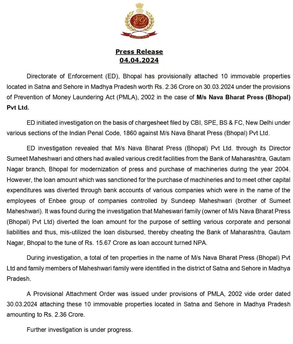 ईडी ने बीते शनिवार को भोपाल की नव भारत प्रेस की 10 अचल संपत्तियों को कुर्क कर लिया ईडी की ओर से दी गई जानकारी के मुताबिक, इन संपत्तियों की कुल कीमत 2.36 करोड़ है। जो मध्य प्रदेश के सतना और सीहोर में स्थित हैं, केंद्रीय जांच एजेंसी ने प्रेस के खिलाफ धनशोधन निवारण अधिनियम (पीएमएलए) के तहत मामला दर्ज किया है। ईडी की ओर से जारी प्रेस रिलीज के मुताबिक, मामले में सीबीआई, एसपीई, बीएस और एफसी द्वारा चार्जशीट दायर की गई थी. बाद में ईडी की जांच में खुलासा हुआ कि प्रेस ने निदेशक सुमित माहेश्वरी और अन्य लोगों ने धोखाधड़ी की है आरोप है कि इन लोगों ने बैंक ऑफ महाराष्ट्र से कर्ज यह कर्ज प्रेस का आधुनिकीकरण करने और नई मशीनों की खरीद हेतू लिया गया हालांकि, बाद में ये पैसा डाइवर्ट करके सुमीत के भाई संदीप माहेश्वरी की कंपनी एनबी समूह के कर्मचारियों को दिया गया। इस तरह पैसे का व्यावसायिक और निजी आर्थिक जिम्मेदारियों का निपटारा करने के लिए प्रयोग किया रिलीज के मुताबिक, बाद में बैंक को ये कर्ज लौटाया नहीं गया।