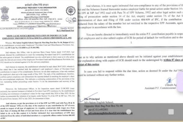 कर्मचारी भविष्य निधि संगठन ने आखिरकार 29 अगस्त 2025 को सालेम इंग्लिश स्कूल को शो काश नोटिस जारी कर ही दिया। यह नोटिस पीएफ की धारा 7 और 14 के उल्लंघन के कारण जारी हुआ है। यदि कार्यवाही जारी रही तो अब आईपीसी की धारा 406, 409 के तहत एफआईआर भी कराई जा सकती है। पीएफ अधिकारी ने सात दिवस के भीतर दिए हुए आदेश का पालन करने को कहा है। जुलाई महीने में ही छत्तीसगढ़ डायोसिस बोर्ड आफ एजुकेशन द्वारा संचालित स्कूलों के बड़ी संख्या में शिक्षकों ने रायपुर कलेक्टर, थाना सिविल लाइन रायपुर में इस आशय की शिकायत की थी। प्रबंधन उसकी पीएफ नहीं पटा रहा और यह राशि 70 लाख पार कर चुकी है। सालेम स्कूल प्रबंधन ने स्वयं यह स्वीकार किया कि उसने अभी 2 करोड़ 53 लाख 23 हजार वेतन का नहीं दिया है। सालेम स्कूल का सीए ऑडिट बिलासपुर के एक सीए के यहां होता है और सूत्र बताते हैं कि 2023 - 24 में स्कूल ने 2553872 रुपए सालेम हॉस्टल पर, प्रॉपर्टी संधारण पर 2504750 रुपए स्कूल विस्तार पर 6037184 रुपए तथा 4626146 रुपए खर्च किया और यह सब राशि फीस से ही आई तो प्रश्न उठता है कि अभी तक पिछला वेतन क्यों नहीं दिया गया। जो पीएफ राशि अभी हाल ही में अग्रिम जमानत प्राप्त करने के पहले जमा हुई जिसके लिए एक दूसरे स्कूल के बैंक खाते से राशि का आहरण हुआ वह तो कर्मचारियों के वेतन के कटौती का हिस्सा है। पीएफ की यह धनराशि जो नियुक्तिदाता को अपने हिस्से का देता है। अभी भी ड्यू है कुल मिलाकर सीडीबीई पंजीकृत और छत्तीसगढ़ डायोसिस अपंजीकृत दोनों के ऑफिस बैरर एक ही हैं और राज्य भर में संचालित कल 19 स्कूल 13 अनुदानित शेष निजी में करोड़ों की वित्तीय अनियमितता है। जिसमें से बर्जेस स्कूल में बिलासपुर कलेक्टर ने जांच कराई पर जांच रिपोर्ट आज तक शिकायतकर्ता को ही नहीं दी जा रही है। बर्जेस स्कूल में चल रही वित्तीय अनियमितता की विस्तृत शिकायत जन्म दर्शन में हुई थी और जांच भी हुई शिकायतकर्ताओं के बयान भी दर्ज हुए जांच अधिकारी ने बर्जेस स्कूल पहुंच कर तथ्यों की जांच भी की पर प्रतिवेदन ना मिलना ही पूरे मामले में पर्दा डालने के समान है।