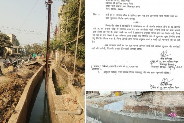 नगर पालिक निगम बिलासपुर जोन क्रमांक 02 के वार्ड क्रमांक 11 में कराए जा रहे आरसीसी नाली निर्माण कार्य में गंभीर अनियमितताएं पाए जाने पर ठेकेदार को कड़ी चेतावनी जारी की है.. यह नोटिस बनाकचौक से गोविंद नगर गेट तक चल रहे नाली निर्माण कार्य को लेकर जारी किया गया है। जोन कार्यालय द्वारा जारी नोटिस में उल्लेख किया गया है कि, शासन द्वारा नगरोत्थान मद के अंतर्गत स्वीकृत उक्त नाली निर्माण कार्य निर्धारित मानकों के अनुरूप नहीं किया जा रहा है। निरीक्षण के दौरान यह पाया गया कि कार्य गुणवत्ता स्तर से नीचे है, जबकि उप अभियंता द्वारा कई बार मौखिक रूप से कार्य को मानक अनुसार करने के निर्देश दिए जा चुके थे, इसके बावजूद ठेकेदार द्वारा मानक अनुरूप निर्माण नहीं किया गया, जिसे गंभीर लापरवाही माना गया है.. नगर निगम ने स्पष्ट निर्देश दिए हैं कि संबंधित ठेकेदार तत्काल प्रभाव से कार्य बंद कर पुनः मानक अनुसार निर्माण कार्य शुरू करें, अन्यथा भुगतान की कार्यवाही नहीं की जाएगी।