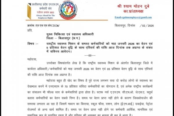 नेशनल हेल्थ मिशन (NHM) के अंतर्गत कार्यरत संविदा कर्मचारियों को छत्तीसगढ़ में पिछले दो महीनों से वेतन नहीं मिलने का मामला सामने आया है। बिलासपुर सहित प्रदेश के कई जिलों में कार्यरत डाक्टरों,नर्स, वार्ड बॉय, लैब तकनीशियन और अन्य स्वास्थ्यकर्मी आर्थिक संकट से जूझ रहे हैं। होली का त्योहार नजदीक होने के कारण कर्मचारियों की चिंता और बढ़ गई है।