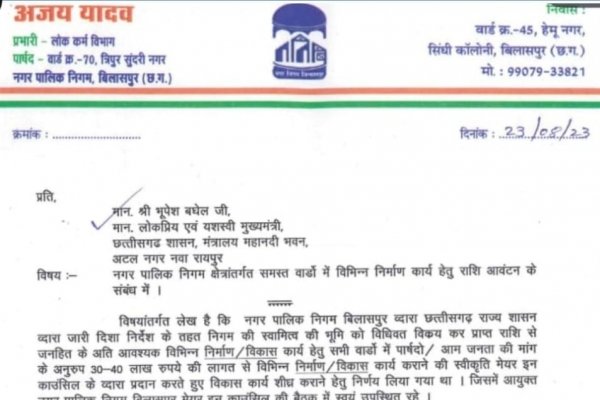 आठवें महीने में नगर पालिका निगम बिलासपुर के कांग्रेसी पार्षदों ने छत्तीसगढ़ के मुख्यमंत्री को एक ज्ञापन सौंपा। कांग्रेस के पार्षदों ने नगर पालिका निगम बिलासपुर के आयुक्त पर यह आरोप लगाया कि वह विकास कार्यों को अवरुद्ध कर रहे हैं और इस तरह की कार्य प्रणाली को अपना रहे हैं जो यदि जारी रही तो निगम क्षेत्र से लगी हुई और निगम सीमा के भीतर वाली विधानसभा सीटों पर कांग्रेस का जितना मुश्किल हो जाएगा। यह ज्ञापन आठवें महीने का है और अब नवा महीना आधा पर हो चुका है अर्थात आयुक्त की कार्य प्रणाली से कांग्रेस का जो नुकसान हो रहा था वो अब अपूरणीय क्षति में बदल गया। 17 तारीख को प्रदेश के मुखिया मुख्यमंत्री भूपेश बघेल का बिलासपुर आगमन है।