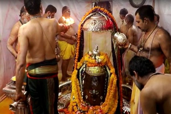 महाकाल मंदिर में रंगपंचमी पर शुक्रवार तड़के भस्मारती में राजाधिराज भगवान महाकाल को फूलों से बना रंग अर्पित किया गया। पुजारियों ने भगवान के साथ होली खेली। कोरोना संक्रमण के कारण इस बार दर्शनार्थियों का प्रवेश प्रतिबंधित था।अवंतिकानाथ की होली के लिए पुजारियों ने गुरुवार को 1 क्विंटल टेसू के फूलों से 200 लीटर प्राकृतिक रंग तैयार किया था। भस्मारती के दौरान भगवान पर सतत रंगधारा प्रवाहित की गई।पुजारी प्रदीप गुरु ने बताया राजाधिराज महाकाल रंगपंचमी पर टेसू के फूलों से बने सुंगधित रंग से होली खेलते हैं। यह परंपरा अनादिकाल से चली आ रही है। प्राकृतिक रंग तैयार करने के लिए आगर व नलखेड़ा के जंगलों से 1 क्विंटल टेसू के फूल मंगवाए गए थे। चार लोगों ने 5 घंटे में 200 लीटर प्राकृतिक रंग तैयार किया।